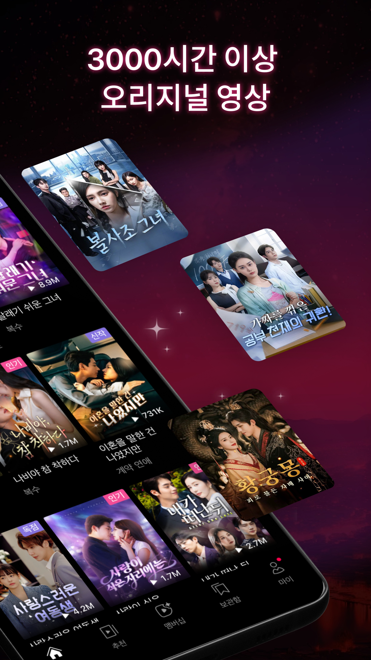 • **다양한 장르의 숏폼 드라마:** 로맨스, 판타지, 스릴러, 코미디 등 폭넓은 장르의 짧고 몰입감 있는 드라마 콘텐츠를 제공하여 사용자의 다양한 취향을 만족시킵니다.